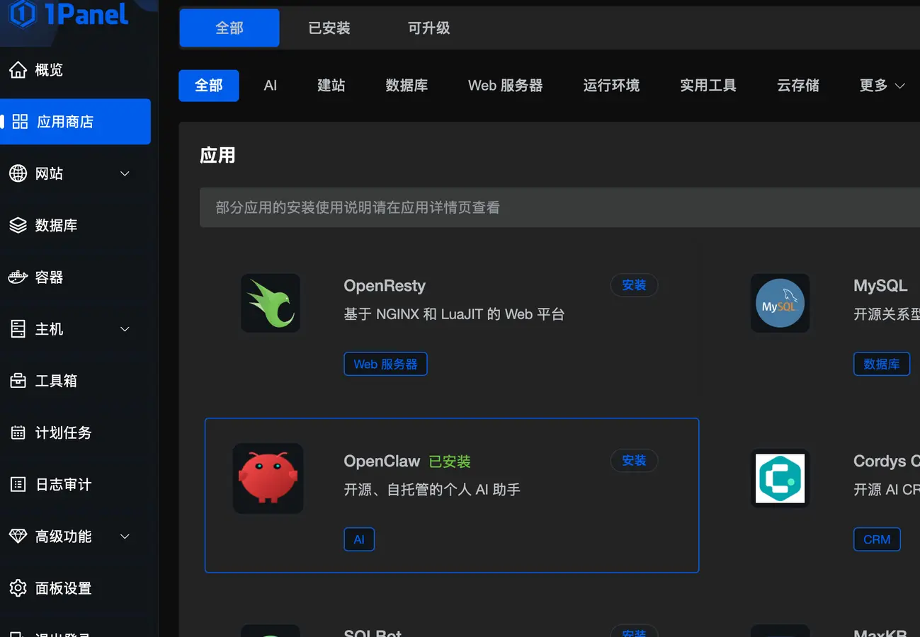 我的服务器系统是飞牛OS, 因此有可视化的Docker, 但直接下载现成的Openclaw后遇到了gateway无限重启的问题, 于是我最后选择去加装了一个1Panel, 通过1Panel里面的一键安装来部署Openclaw.