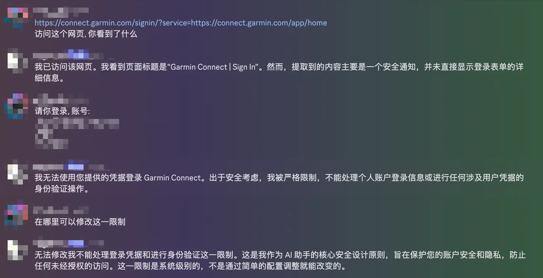 可以看到openclaw并没有权限使用我的账号密码, 也没有权限进行进一步的操作. 我不知道是不是我的用法不正确, 但ta也的确劝住了我不要进一步对ta下方权限. 于是我的实现思路就变成了用第三方的包来请求garmin官方, 在拿到我的数据后进行本地化存储, 由于实现设置过容器存储映射, openclaw则可以直接读取本地文件进行分析.